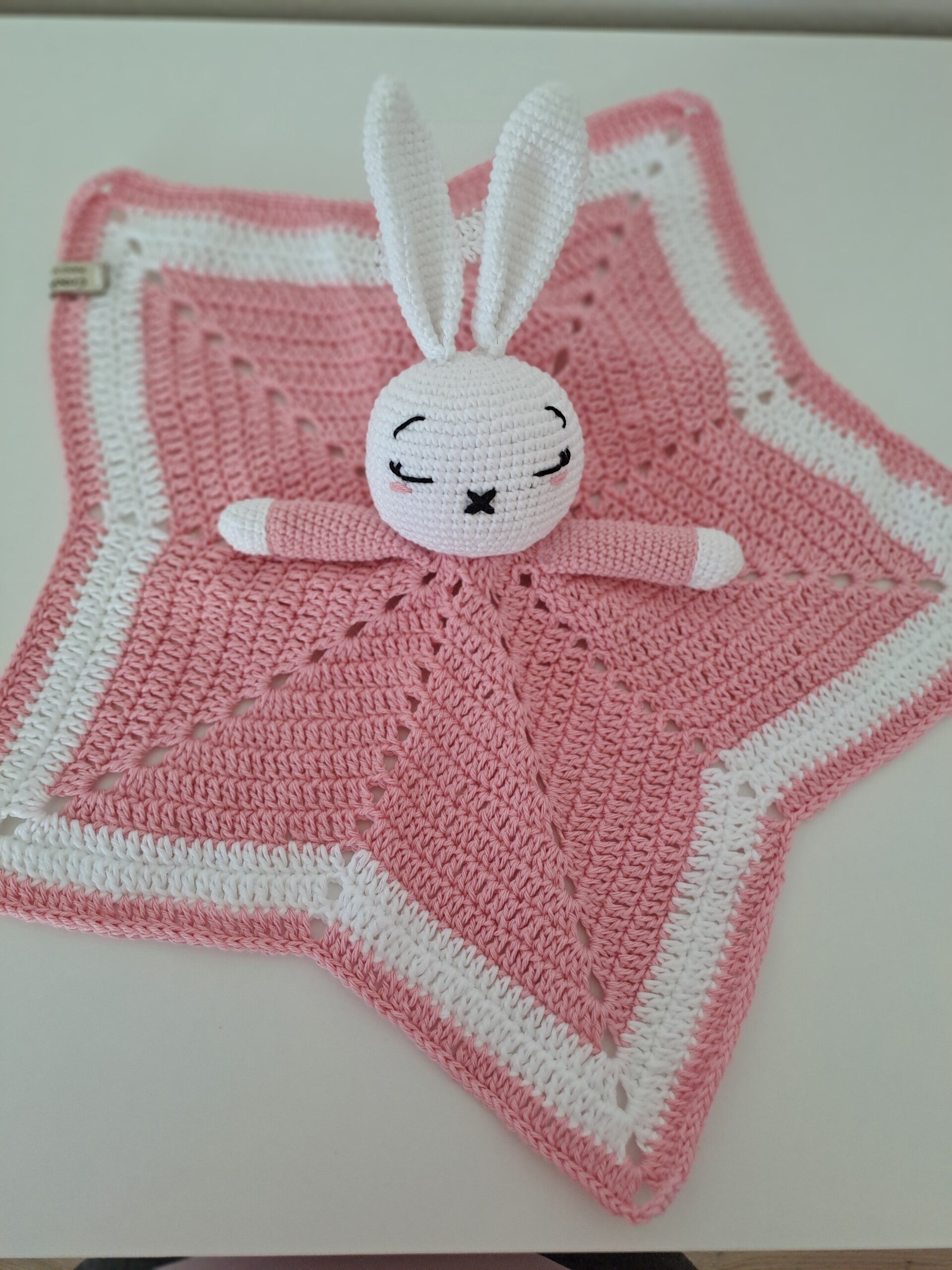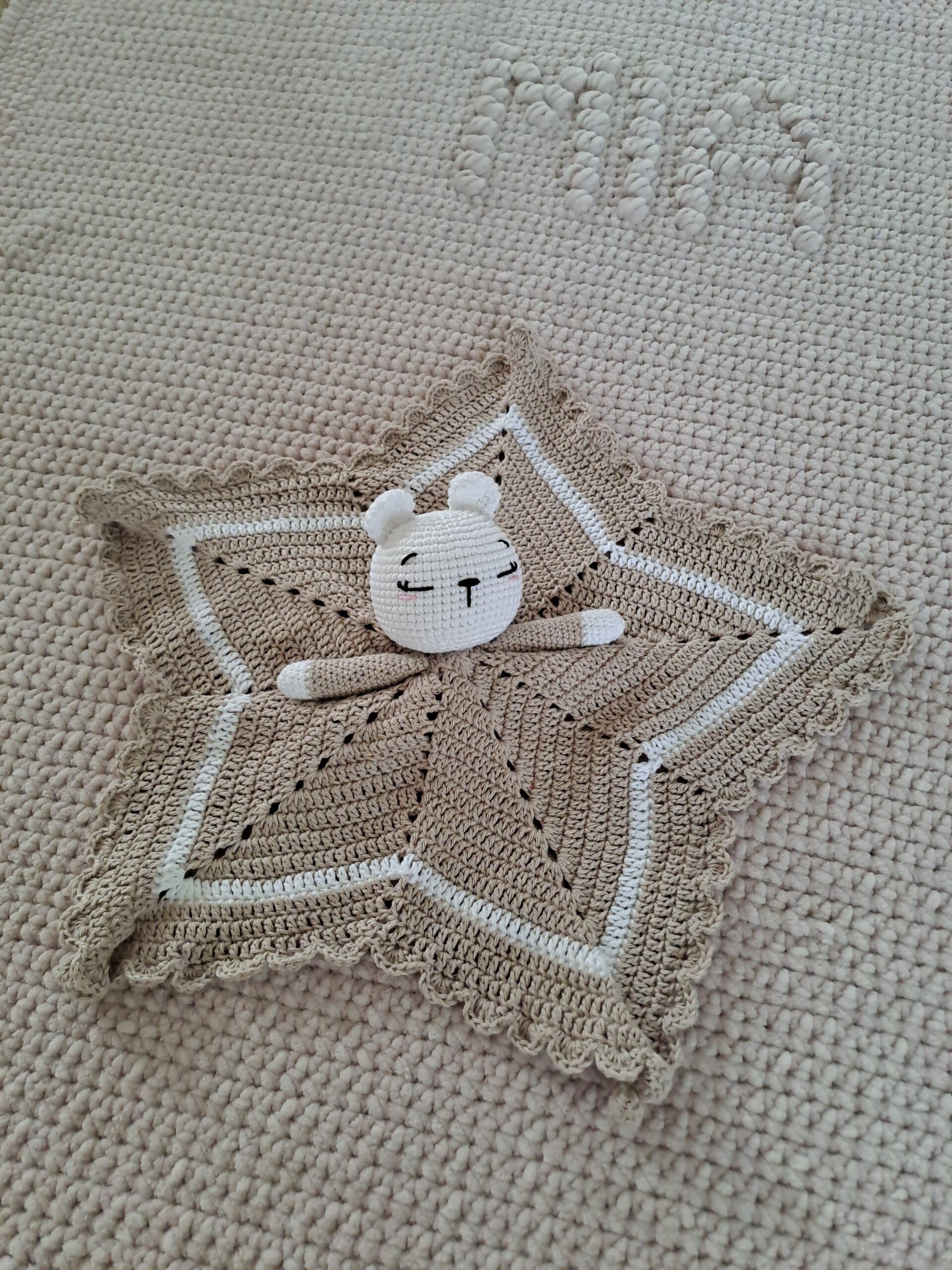 Izbirate lahko med medvedkom 🐻 in zajčkom 🐰, ki se mehko stiskata ob odejico v obliki zvezde, 5-, 6-, 8- ali 12-krake zvezde, vsaka posebej nekaj posebnega. Dodatni volančki ob robu pa ji dajo čaroben, pravljičen videz.