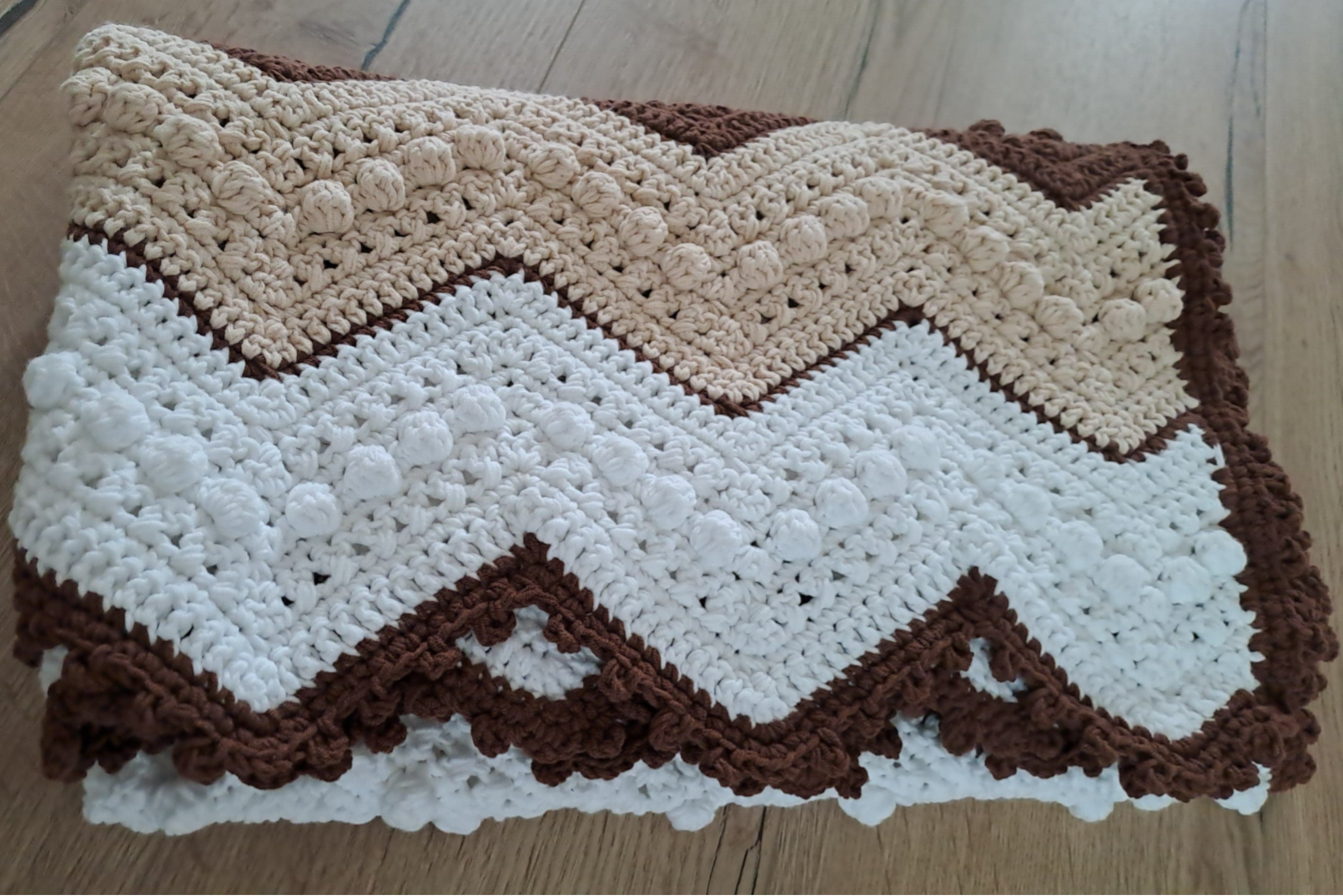 Kvačkana odejica Mehurčki je prava pravljica v mehki preji. Polna drobnih, ljubkih mehurčkov, ki ustvarjajo čudovit vzorec z igrivim 3D učinkom ✨. Nežen valovit rob pa odejici doda pridih elegance in pravljičnosti.